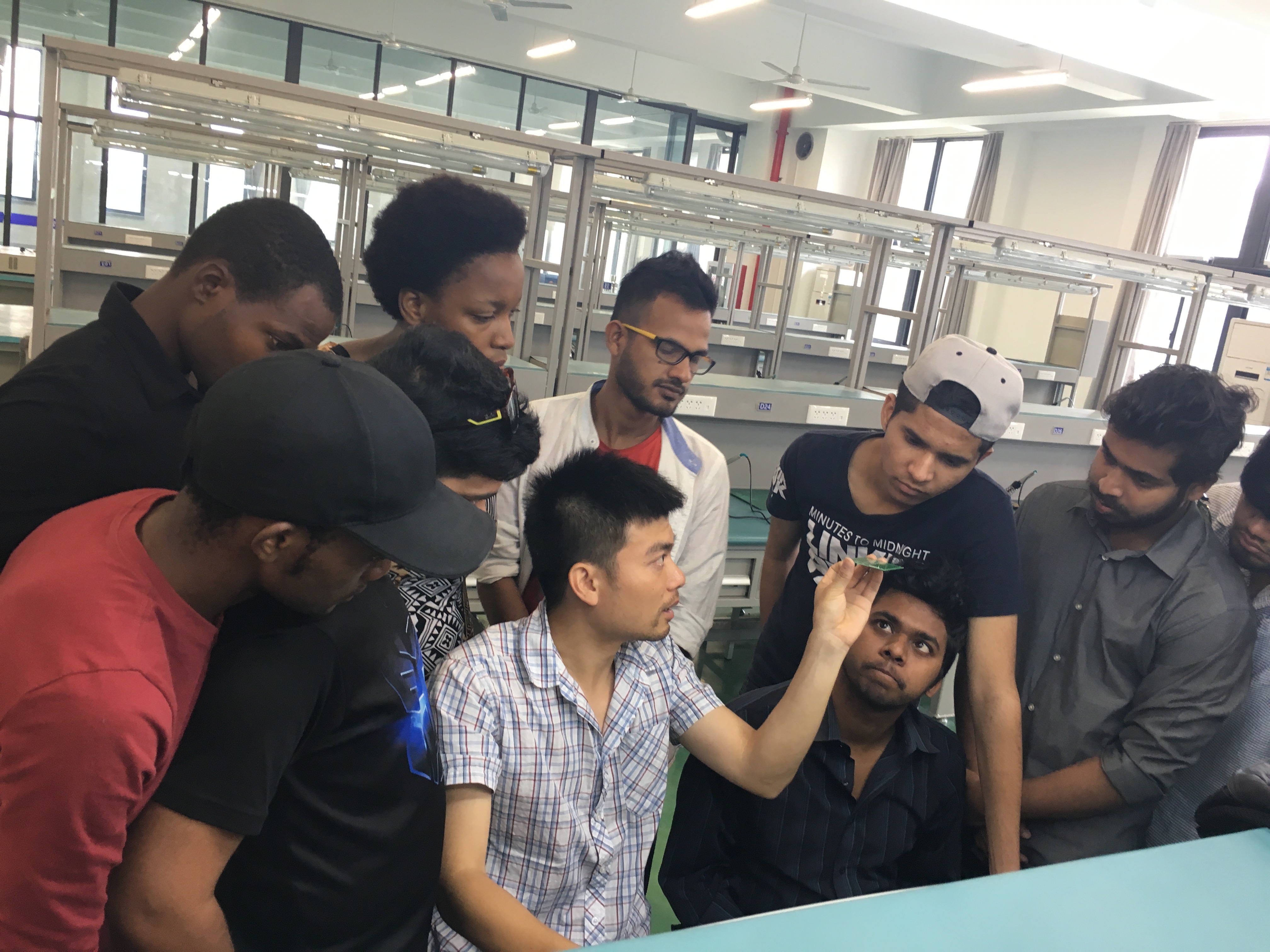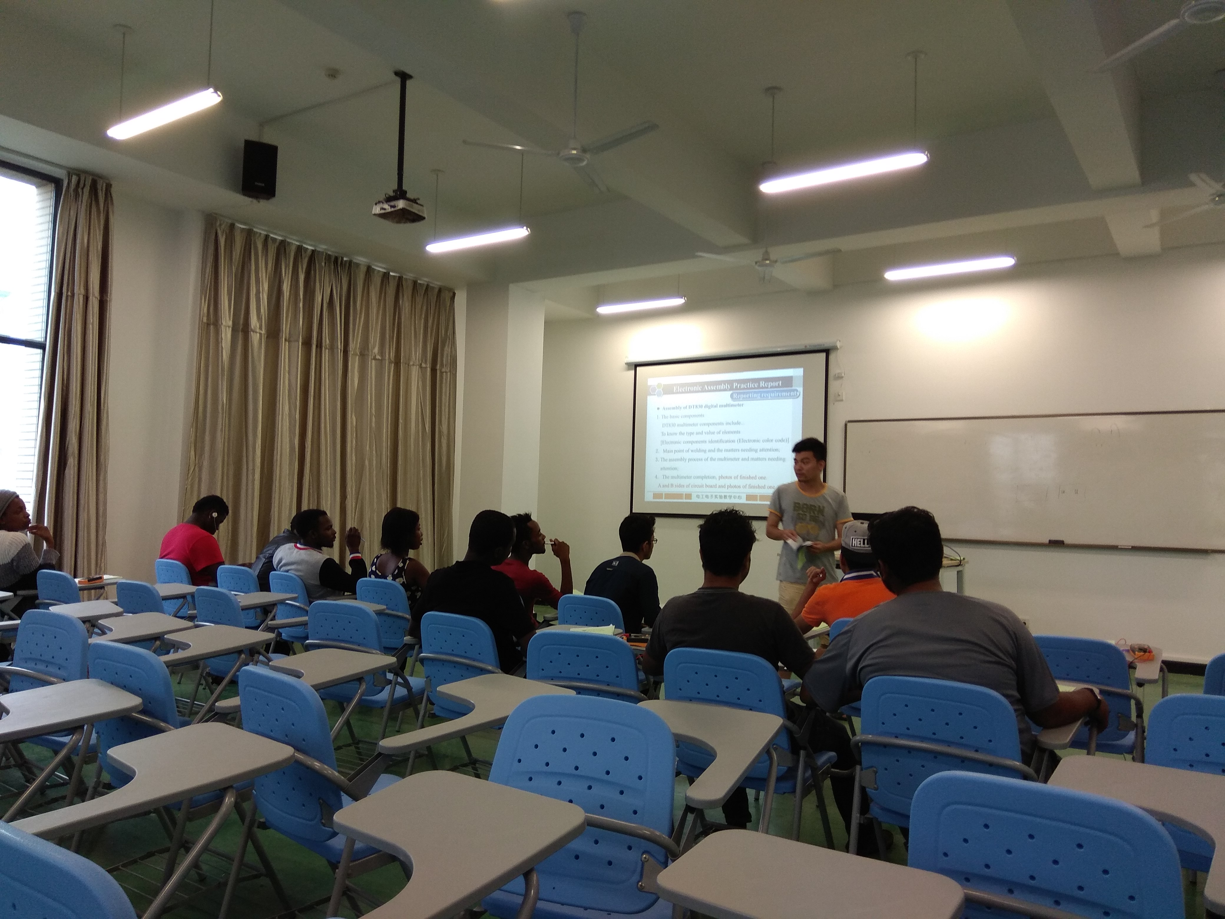 2017年6月18日,F160101班的17位外国留学生来到工程训练中心,开展为期一周的电装实习。这是中心成立以来第一次承担留学生的实习教学任务,是对主讲老师以及相关人员能力上的一次考验。中心领导也十分重视,在实习期间多次进行督查,确保实习安全、有序进行。经过一周的努力,圆满完成了实习任务。通过这次实习教学活动,进一步提高了中心的实验室管理水平、老师的教学能力,尤其是英语沟通的能力,是一次难得的锻炼机会。