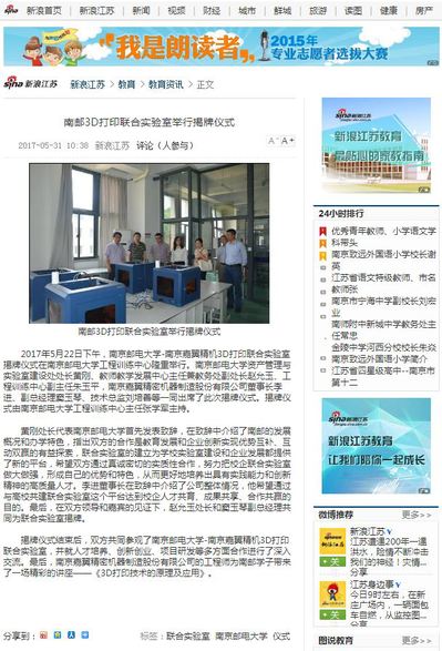 【新浪江苏】南邮3D打印联合实验室举行揭牌仪式