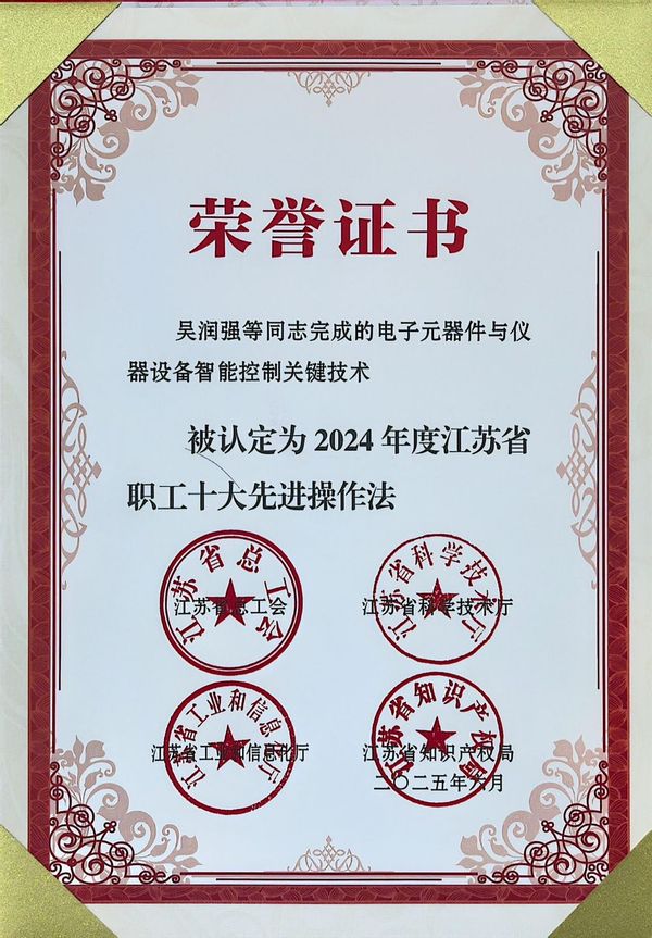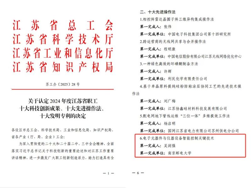近日,江苏省总工会、江苏省科学技术厅、江苏省工业和信息化厅、江苏省知识产权局联合下发了《关于认定2024年度江苏省职工十大创新成果、十大先进操作法、十大发明专利的决定》。304am永利集团吴润强团队(吴润强、任青颖、孙科学)共同完成的“电子元器件与仪器设备智能控制关键技术”项目成果喜获“2024年江苏省职工十大先进操作法”,实现学校该奖项零的突破,也是全省高校该年度唯一获奖成果。