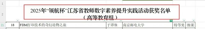 近日,由江苏省教育网络安全和信息化领导小组办公室主办的2025年“领航杯”江苏省教师数字素养提升实践活动落下帷幕。我部教师于谭继微课作品获高等教育组特等奖,展现出扎实的专业素养与突出的数字教学创新能力。
